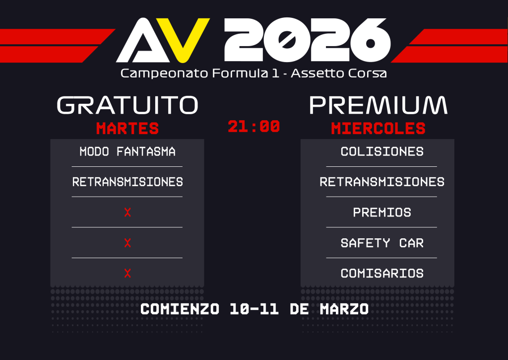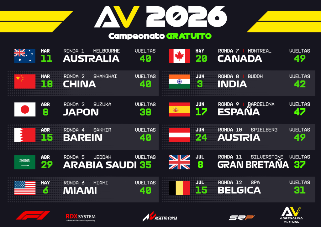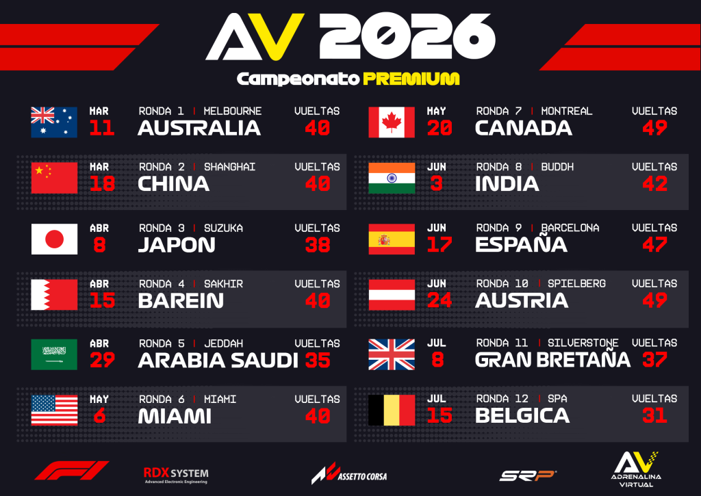 – Empieza el 11 de Marzo, coincidiendo con las carreras de la Fórmula 1 real, hasta el 8 de Julio. Después, en Septiembre, se organizará una segunda temporada.